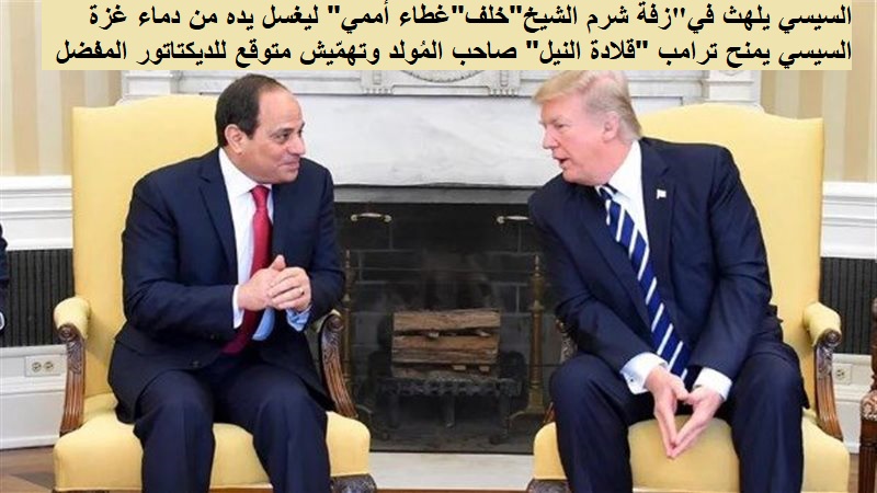 السيسي يلهث في”زفة شرم الشيخ”خلف”غطاء أممي” ليغسل يده من دماء غزة ويُعيد تسويق نفسه دولياً.. الاثنين 13 أكتوبر 2025م.. السيسي يمنح ترامب صاحب المُولد “قلادة النيل” وتهمّيش متوقع للسيسي ديكتاتوره المفضل وإسرائيليون يصفقون للسيسي من قلب تل أبيب