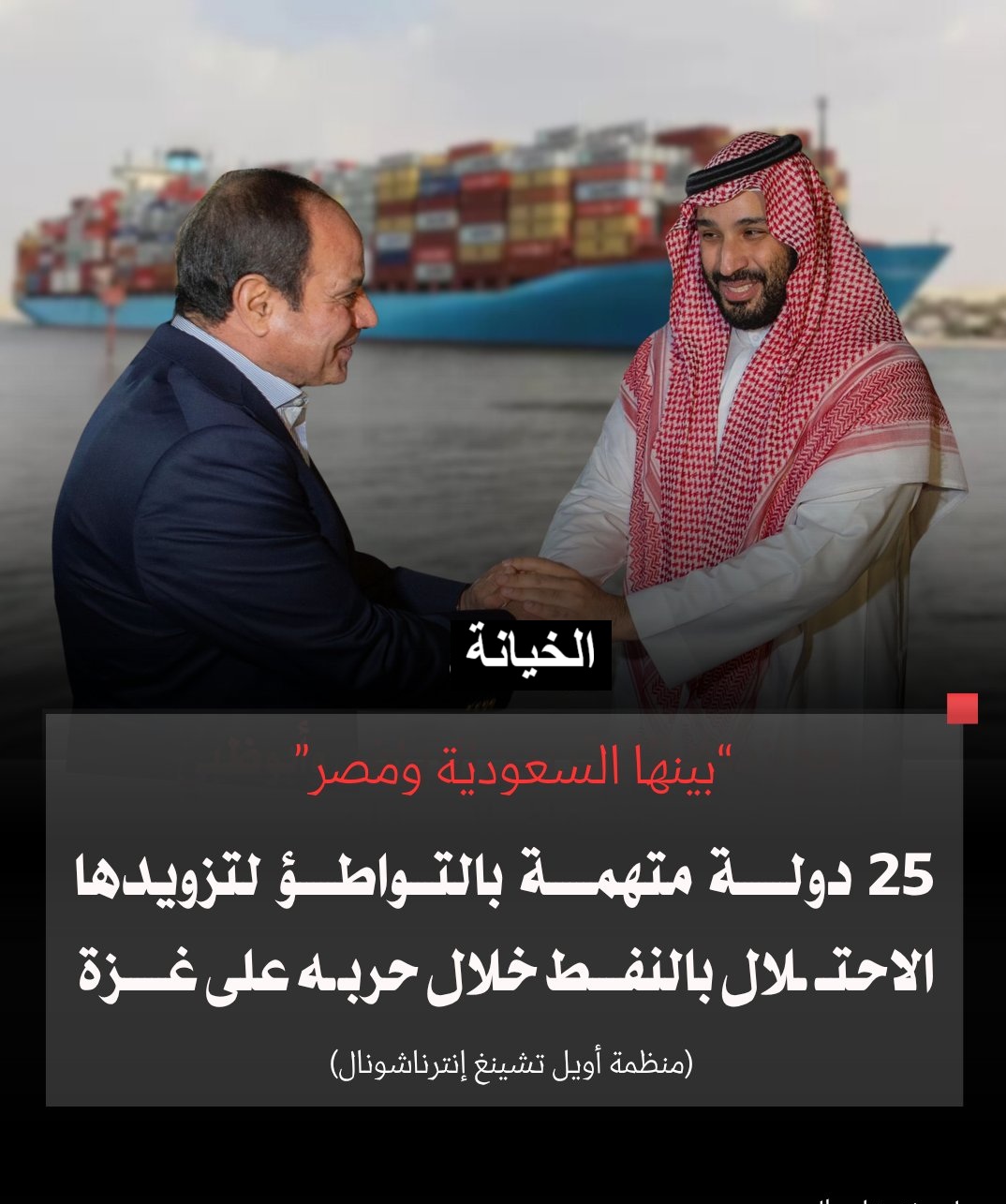 تقرير دولي جديد يهزّ ملف غزة: منظمة “أويل تشينغ إنترناشونال” تكشف تورط 25 دولة في تزويد الاحتلال بالنفط بين نوفمبر 2023 وأكتوبر 2025. أسماء معروفة: أذربيجان، كازاخستان، روسيا، اليونان، أمريكا… لكن الصدمة تأتي من المنطقة العربية نفسها.