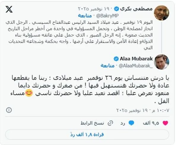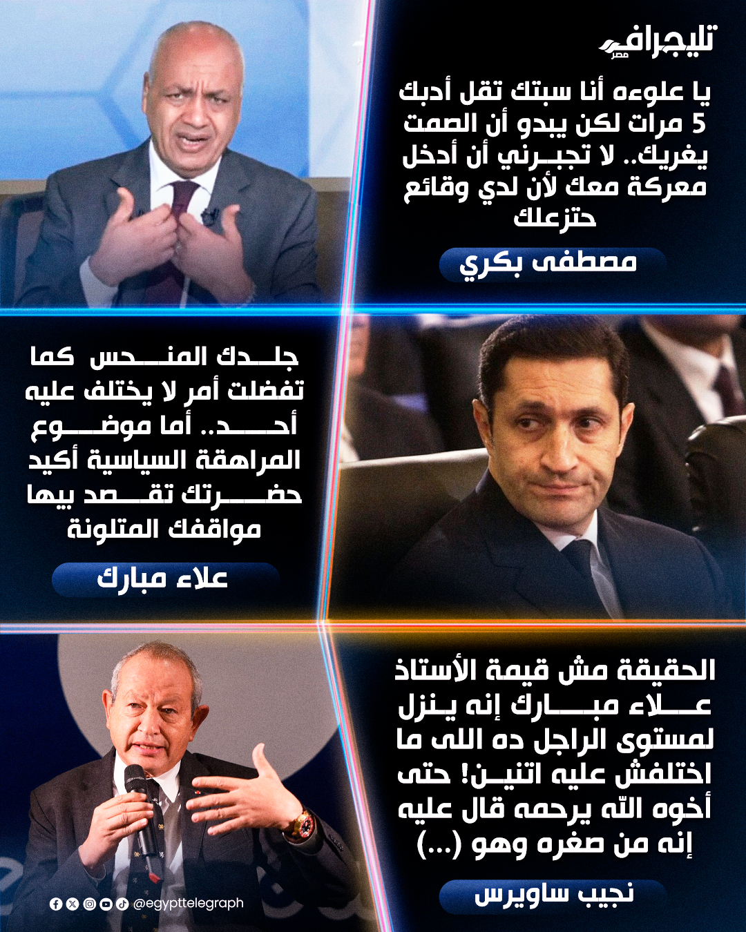 تقارير النظام المصري والمقررة الأفريقية تغفل الانتهاكات الأساسية لحقوق الإنسان فواجب على اللجنة الأفريقية لحقوق الإنسان حماية الحقوق.. السبت 22 نوفمبر 2025م.. معركة إهانات علاء مبارك وبكرى إهانات تكشف صراعاً أعمق داخل معسكر الحكم والمحامي الراحل طلعت السادات كشف فساد مصطفى بكري