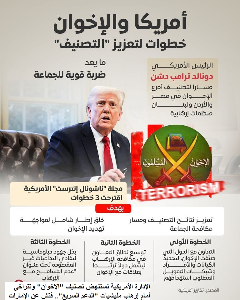 واعتبرت أن رسالة قرار واشنطن من توقيع ترامب أمرًا تنفيذيًا لتصنيف بعض فروع الإخوان كمنظمات “إرهابية” تكمن في كلمة “بعض” التي تعني ككلمة مفتاحية أن هناك فروعًا خارج التصنيف، ما يفتح الباب لتوسيع المفهوم مستقبلًا ليشمل “الإسلام السياسي” ككل.