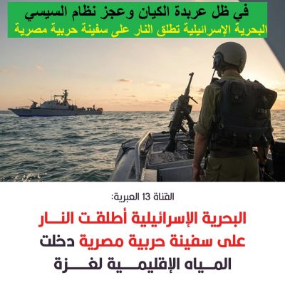 في ظل عربدة الكيان وعجز نظام السيسي البحرية الإسرائيلية تطلق النار على سفينة حربية مصرية.. الجمعة 9 يناير 2026م.. تصاعد الاحتجاجات بسجون مصر بسبب سياسة “القتل البطيء” وسجن بدر 3 على صفيح ساخن: منع الامتحانات ومحاولات انتحار وإضرابات جماعية تكشف تصعيدًا أمنيًا ضد المعتقلين