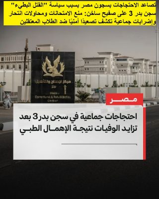 وتشير التقارير إلى أن أجنحة سجن بدر 3 تشهد منذ أكثر من أسبوعين موجة احتجاجات متواصلة، تنوعت بين الإضراب عن الطعام، والطرق المستمر على الأبواب، وحجب الكاميرات، في تعبير جماعي عن الغضب ورفض السياسات المتبعة.