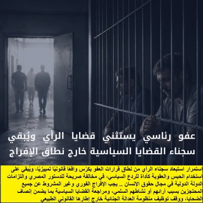 غير أن القرار تدابير العفو لم تشمل المحكوم عليهم في قضايا الرأي أو القضايا ذات الطابع السياسي، على الرغم من اتساع دائرة هذه القضايا، واستمرار احتجاز أعداد كبيرة من المتهمين على خلفية ممارسة حقوقهم السلمية المكفولة دستوريًا.