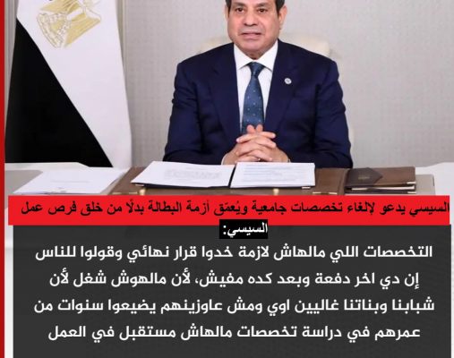 وقال السيسي خلال حديثه عن سوق العمل: “التخصصات اللي ملهاش لازمة خدوا القرار وقولوا للناس هتتخرج من الدفعة السنة دي والسنة القادمة مفيش لأنه ملوش شغل”، وهو تصريح فُهم على أنه دعوة مباشرة لإغلاق بعض المسارات الأكاديمية القائمة منذ سنوات طويلة.