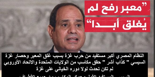 السيسي “سمسار” المعبر ودعم (UE) وقروض “النقد” و”المعونة” رشاوى دولية تكشف كذب النظام المصري .. الأحد 3 أغسطس 2025م.. مصر تتصدر صادرات الغذاء إلى الاحتلال الإسرائيلي بقيمة 3.8 مليون دولار في يونيو