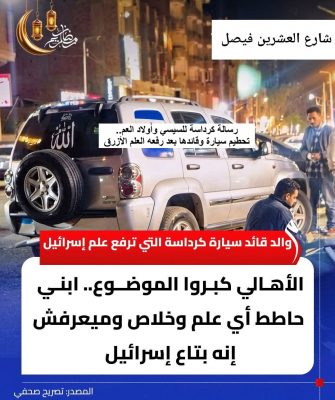 وأكد الحساب عبر @ERC_egy أنه “لم يجرؤ مصري من قبل على رفع علم “إسرائيل” قبل حكم #السيسي_عدو_الله، ولم يذهب بالسيارة إلى العاصمة الإدارية ولا التجمع بل إلى #كرداسة المدينة الأبية التي أعدم #السيسي_الصهيوني 8 من أبنائها واعتقل الآلاف، لأنهم عرفوا حقيقته وعارضوه، ذهب ليثير الشغب، وأن يجمع علم إسرائيل واسم الله ﷻ على سيارة واحدة فأمر مثير أكثر للريبة، هذا الحادث الغريب في مصر ليس بريئاً أبداً، بل تمهيد لمصيبة وفاتحة للإعلام لإثارة موضوع التطبيع الشعبي مع “إسرائيل“.