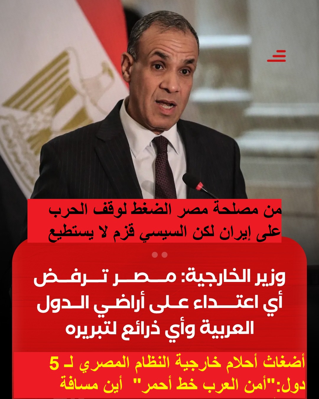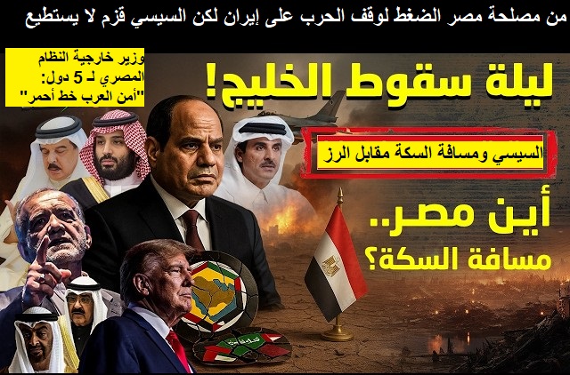 أضغاث أحلام خارجية النظام المصري لـ 5 دول:”أمن العرب خط أحمر” والسيسي:”مسافة السكة” من مصلحة مصر الضغط لوقف الحرب على إيران لكن السيسي قزم لا يستطيع.. الاثنين 9 مارس 2026.. تذاكر عودة “خرافية” من الخليج للمصريين مقابل تسهيلات عبور طابا للأمريكيين والإسرائيليين