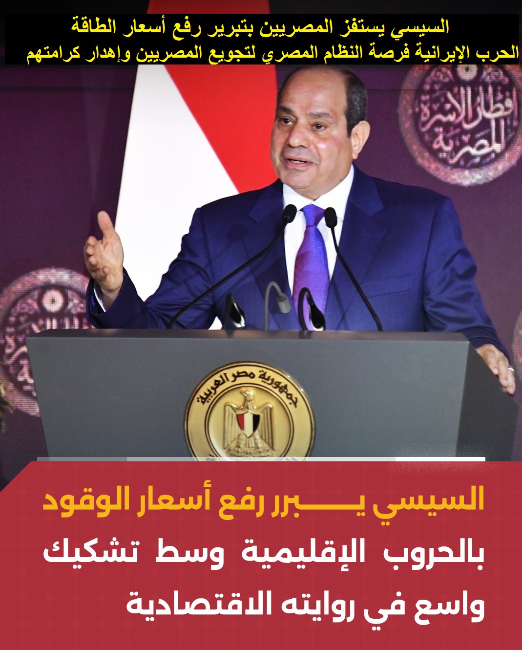أثار عبد الفتاح السيسي، مساء السبت، جدلا واسعا خلال حديثه عن أزمات مصر الاقتصادية الحالية، واضطرار حكومته الأسبوع الماضي لرفع أسعار الوقود بين (14 و30 بالمئة) في ظل الحرب (الأمريكية-الإسرائيلية) على إيران، حيث أطلق عدة تصريحات رأى فيها محللون تضاربا تاما مع سياساته.
