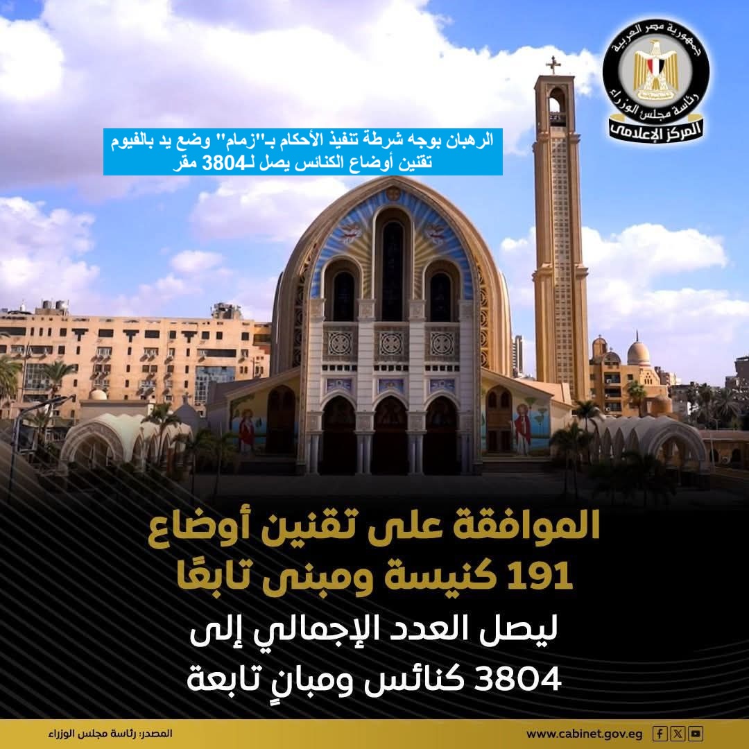 وقبل أيام أعلن مجلس وزراء حكومة السيسي المصادقة على توصيات اللجنة الرئيسية المنصوص عليها في قانون تنظيم بناء وترميم الكنائس رقم 80 لسنة 2016، خلال اجتماعها المنعقد في 16 أبريل 2026، بشأن توفيق أوضاع 191 كنيسة ومبنى تابعًا جديدًا ليرتفع إجمالي عدد الكنائس والمباني التي قنن السيسي أوضاعها منذ بدء عمل اللجنة وحتى الآن إلى 3804 كنائس ومبانٍ على مستوى الجمهورية.